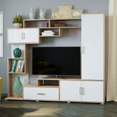 Модный урбанистический дизайн и светлые декоры. Все модули можно собрать в готовую композицию, скрепить между собой, получив жёсткую конструкцию. Тумбы под ТВ может быть укомплектована подсветкой, которая эффектно смотрится в интерьере и подчёркивает широкую нишу, свободную от перегородок. Тумба под ТВ подготовлена для прокладки проводов телевизора и медиа-техники. Большинство фасадов освобождены от лицевой фурнитуры, а ручки на пеналах выполнены из алюминия.
